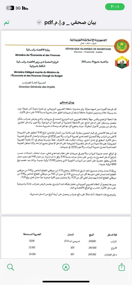 التيار (نواكشوط) - قالت خلية الاتصال بالمديرية العامة للضرائب، إنها فوجئت بتداول معلومات غير دقيقة عبر وسيلة إعلامية وبعض المدونين، تزعم أن موريتانيا تفرض ضريبة بنسبة 40% على دخل الأفراد.