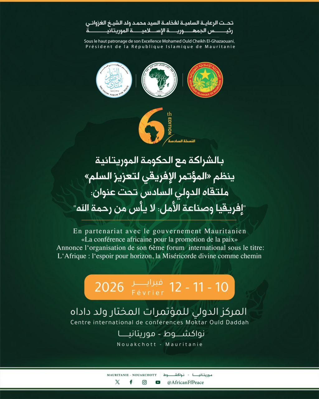التيار (نواكشوط) - أعلن المؤتمر الإفريقي لتعزيز السلم، اليوم الأربعاء، أن العاصمة الموريتانية نواكشوط ستستضيف الملتقى الدولي السادس للمؤتمر، خلال الفترة من 10 إلى 12 فبراير 2026، برعاية رئيس الجمهورية محمد ولد الشيخ الغزواني، وبالرئاسة العلمية للشيخ عبدالله بن بيّه.