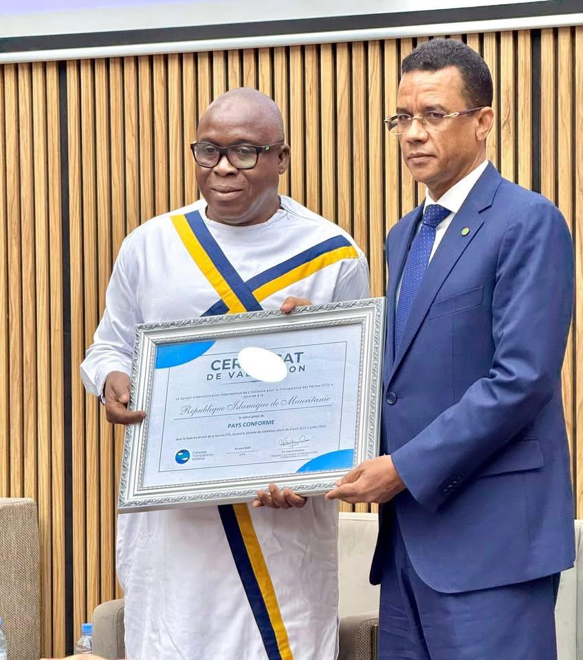 وتسلم وزير الصيد والبنى التحتية البحرية والمينائية، الفضيل سيداتي أحمد لولي، الشهادة من السيد منصور أندور، المنسق الإقليمي لمبادرة FiTI في إفريقيا الفرنكوفونية، بحضور عدد من الشركاء الفنيين والماليين، وممثلي الفاعلين المهنيين في القطاع.