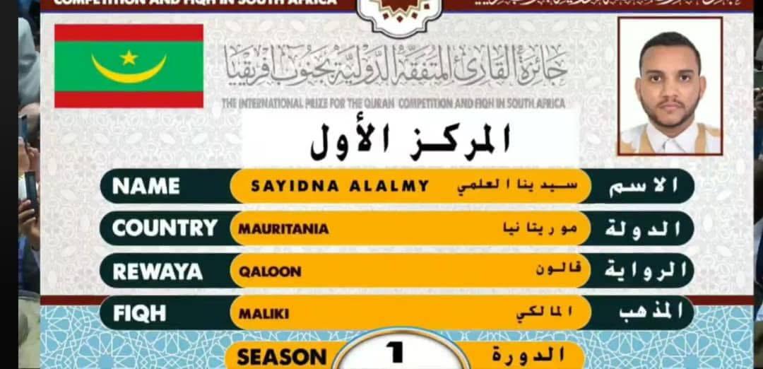 التيار (انواكشوط) - فاز القارئ الموريتاني سيدينا العلمي القلة بالمركز الأول في النسخة الأولى من مسابقة القارئ المتفقه، التي استضافتها جنوب إفريقيا لعام 1447هـ/2025م، وسط مشاركة نخبة من القراء من مختلف الدول الإسلامية.