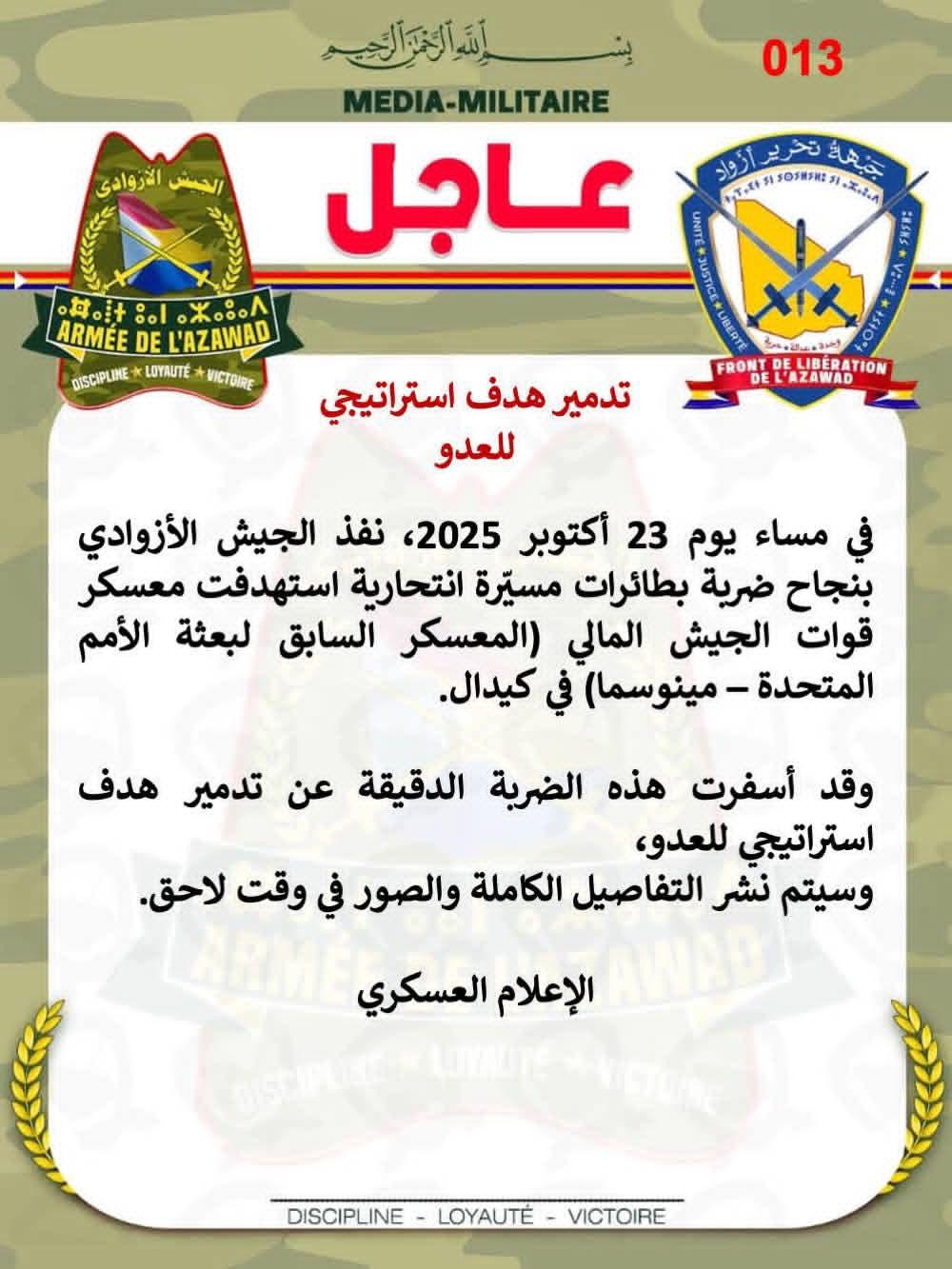 التيار (باماكو) - أعلن الإعلام العسكري للجيش الأزوادي التابع لحركة تحرير أزواد، قبل قليل، تنفيذ ضربة بطائرات مسيرة انتحارية استهدفت معسكرا لقوات الجيش المالي في مدينة كيدال، مساء الثالث والعشرون من الشهر الجاري، المعسكر السابق لبعثة الأمم المتحدة (مينوسما).