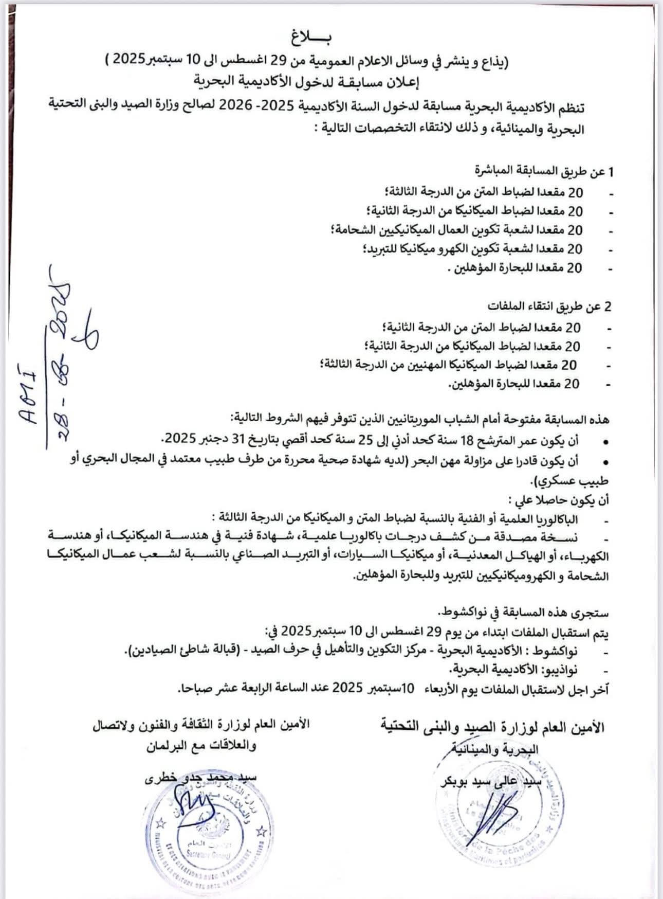 التيار(نواكشوط) - أعلنت الأكاديمية البحرية تنظيم مسابقة لدخول السنة الأكاديمية 2025 – 2026، لانتقاء 180 مقعدا موزعة بين المسابقة المباشرة وانتقاء الملفات.
