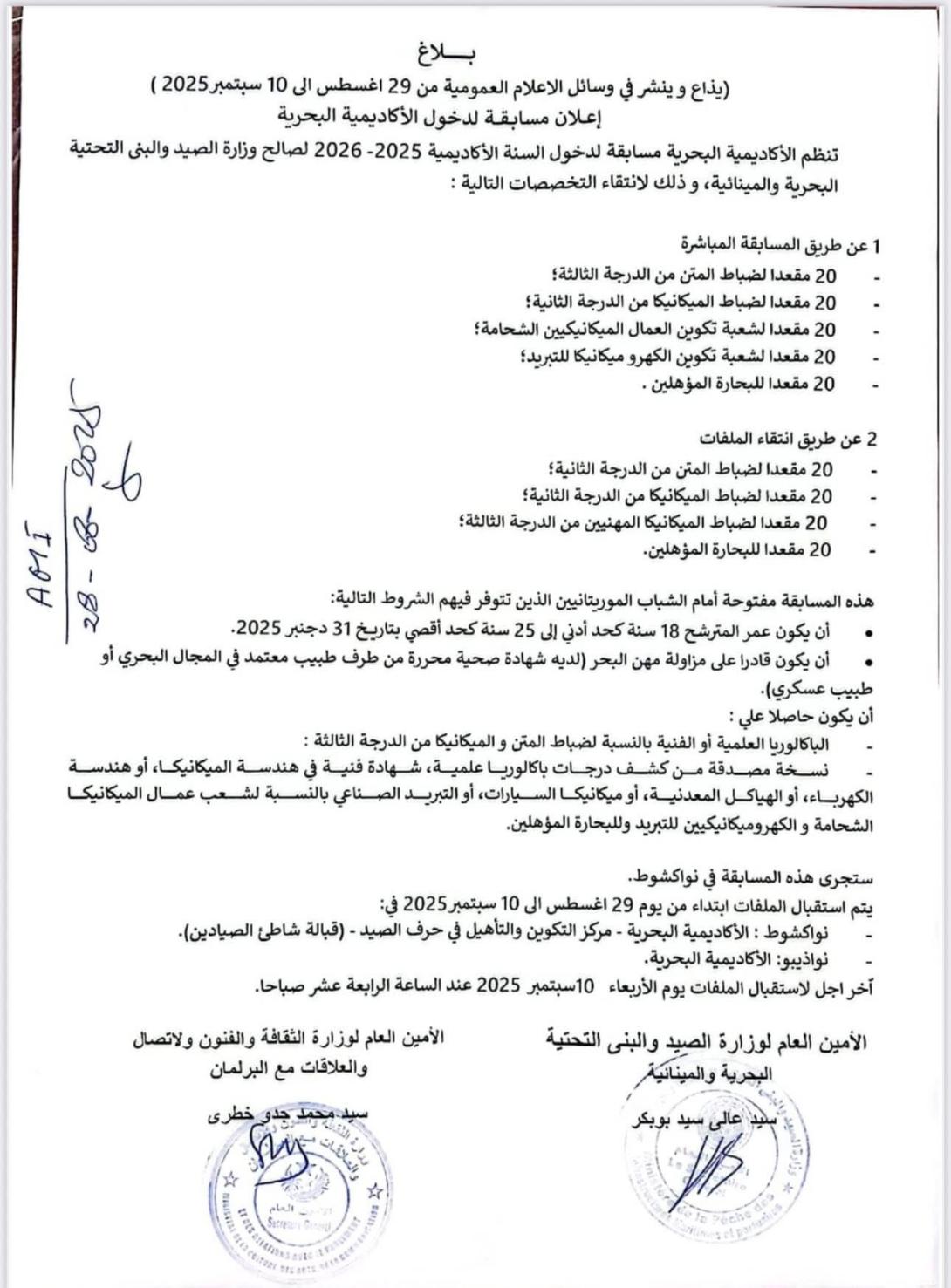 وأشار الإعلان إلى أن استقبال الملفات سيبدأ من 29 أغسطس وحتى 10 سبتمبر، في مقر الأكاديمية البحرية بنواكشوط، ومركز التكوين والتأهيل في حرف الصيد، إضافة إلى مقر الأكاديمية في نواذيبو.