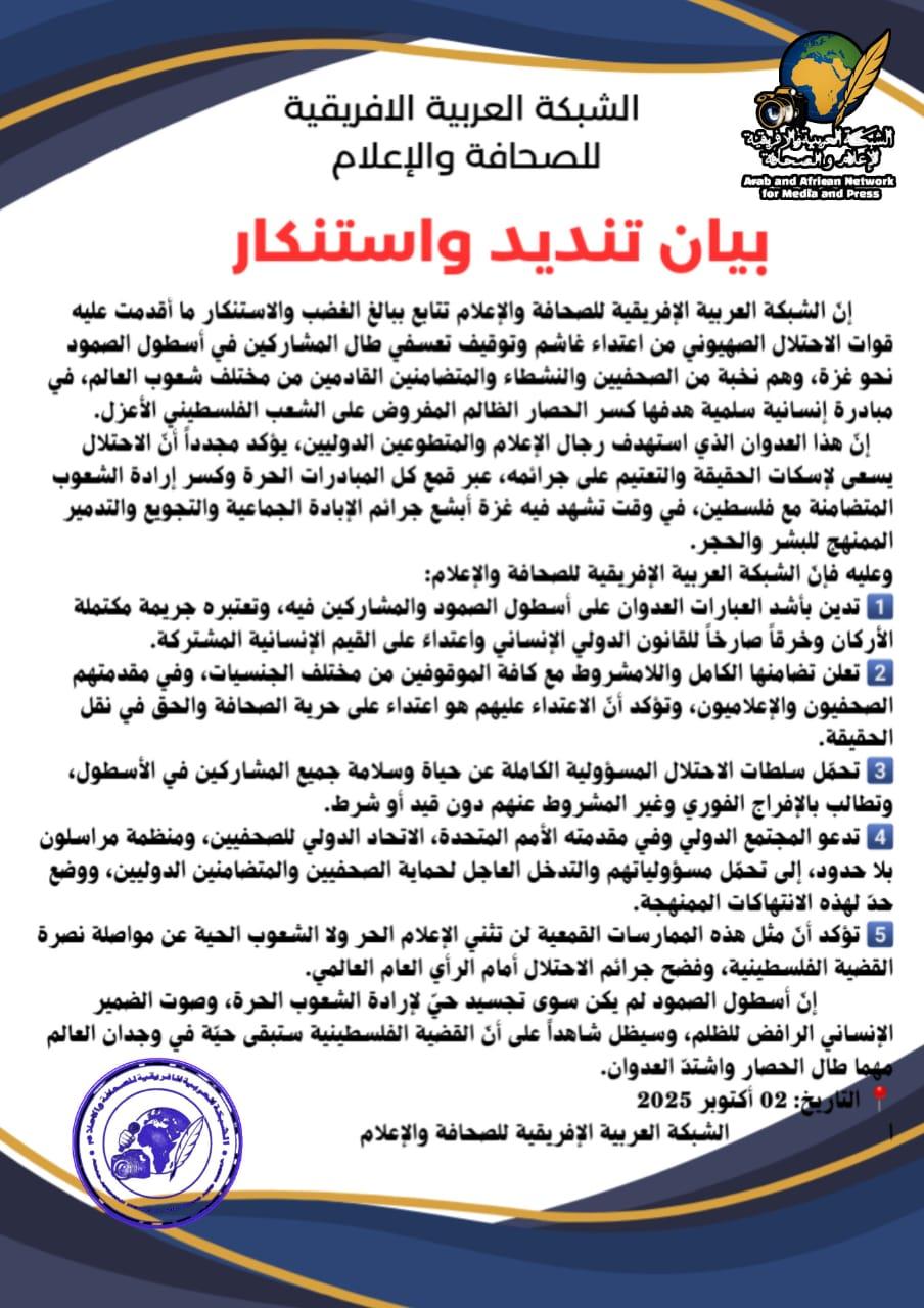 وأكد البيان على أن "الممارسات القمعية لن تثني الإعلام الحر ولا الشعوب الحية عن مواصلة نصرة القضية الفلسطينية وفضح جرائم الاحتلال أمام الرأي العام العالمي"، مشددا على أن أسطول الصمود "تجسيد لإرادة الشعوب الحرة وصوت الضمير الإنساني الرافض للظلم".