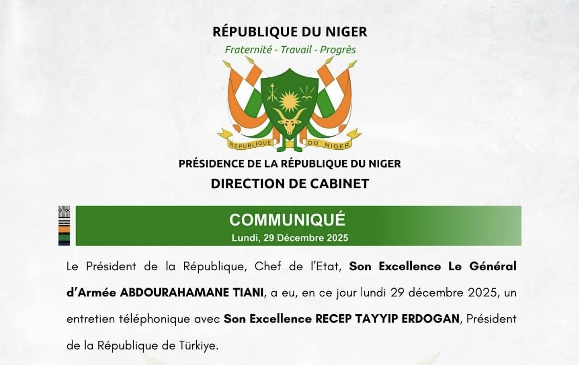 ووفق بيان صادر عن الرئاسة النيجرية، بحث الجانبان خلال الاتصال آفاق تعزيز التعاون بين النيجر وتركيا، مؤكدين تطابق وجهات النظر حول كثير من الملفات، ومشيدين بمستوى العلاقات القائمة بين البلدين في مجالات متعددة.