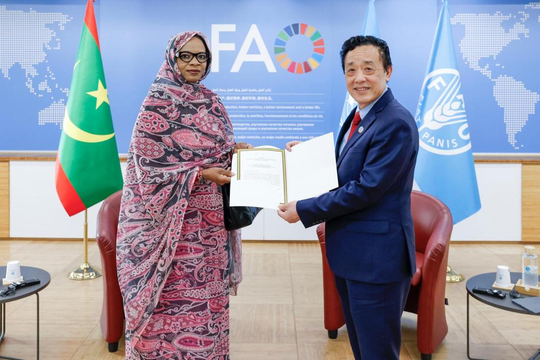 التيار (نواكشوط) - قدمت خديجة امبارك فال، الجمعة 20 فبراير 2025 بالعاصمة الإيطالية روما، أوراق اعتمادها إلى المدير العام لـمنظمة الأغذية والزراعة للأمم المتحدة، شو دونيو، وذلك بصفتها ممثلة دائمة للجمهورية الإسلامية الموريتانية لدى هذه المنظمة الأممية.