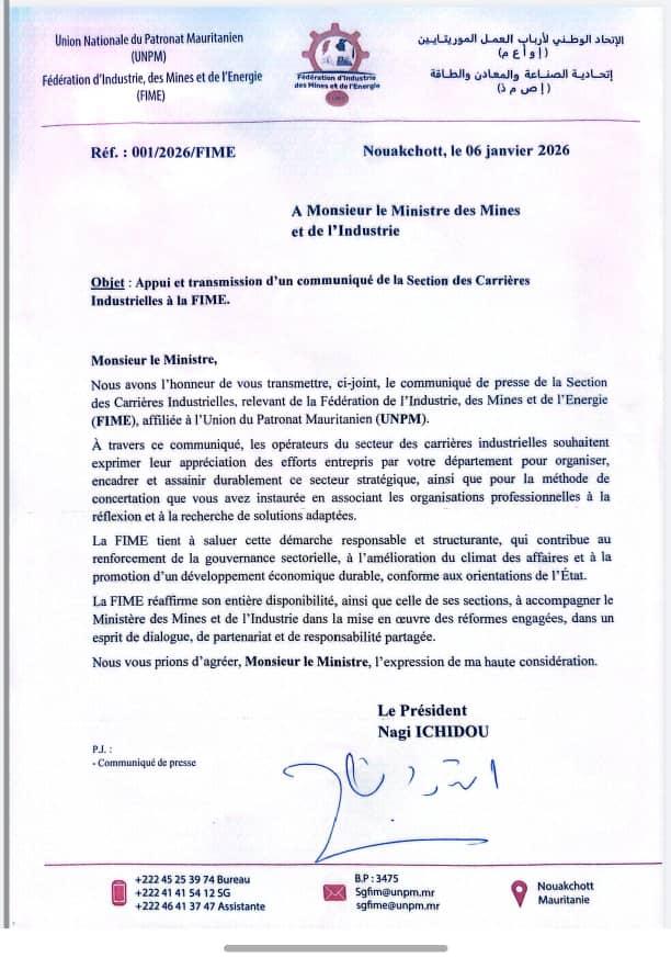 التيار (نواكشوط) - قالت اتحادية الصناعة والمعادن والطاقة (FIME)، المنضوية تحت مظلة الاتحاد الوطني لأرباب العمل الموريتانيين، إن الإصلاحات التي أقدمت عليها وزارة المعادن والصناعة لتنظيم وضبط قطاع المقالع الصناعية تمثل خطوة هيكلية ومسؤولة لتعزيز حوكمة هذا القطاع الاستراتيجي.