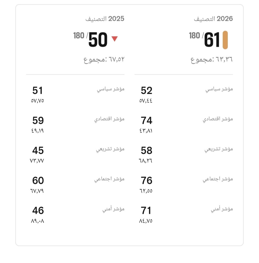 وبحسب التقرير، توزعت مؤشرات موريتانيا لسنة 2026 على النحو التالي:
